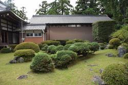 中庭は庫裡と書院の間に位置し、両者の切妻屋根の取り合いに4間×2間半の空間を造り、屋根はない。中庭は南面に庫裡座敷の20畳と40畳分の大広間(板間)、東面に前述の幅1間の廊下、西面に10畳と3畳の座敷、北側には書院の14畳、6畳、21畳の座敷が接しており、中庭の南、北、西の3方に落縁が廻っている。なお、中庭の西側に設けられた10畳と3畳は庫裡と書院を繋いでおり、両室西側には庫裡と書院を繋ぐ廊下と通路土間が通り、鉤型に折れて本堂に結ばれている。