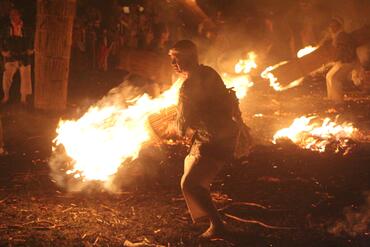 毎年8月15日のお盆の夜、長篠・設楽原決戦場跡にある信玄塚において火おんどりが行われます。信玄塚とは設楽原決戦の戦死者を葬った塚のことです。いわれでは合戦後間もなくこの塚から大量の蜂が発生し、人々を苦しめました。これを武田の亡霊だと考えた村人たちが、戦死した武田軍の霊を慰めるために、長さ2、3m直径80cmほどの松明を燃やして信玄塚で供養したのがこの祭りの始まりだと言われています。村の男たちはそれぞれ、大きな松明を抱え、鉦や太鼓の囃子にのって、8の字を描くように松明を振り回します。
