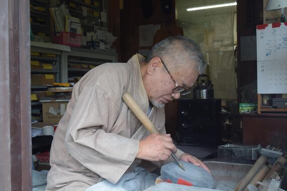 名倉利幸(五代 名倉鳳山)氏は平成15年に五代鳳山を襲名、平成22年に新城市無形文化財「鳳来寺硯制作」の保持者として認定。採石された原石を最大限に活用し、材質や模様に即した一品制作に徹し、姿においても千差万別となっている。