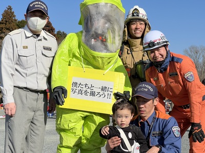 色々な災害に対応するための消防の装備を着た隊員が、突然登場するよ!