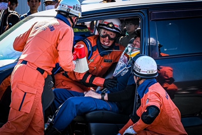 高速交通救助事案を想定し、救助工作車(レスキュー車)など計5台もの車両が出動する大規模な訓練です!