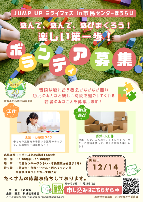 当日実行委員会と一緒に幼児と遊んでくれる若者ボランティア(中学生から29歳以下まで)を募集しています。